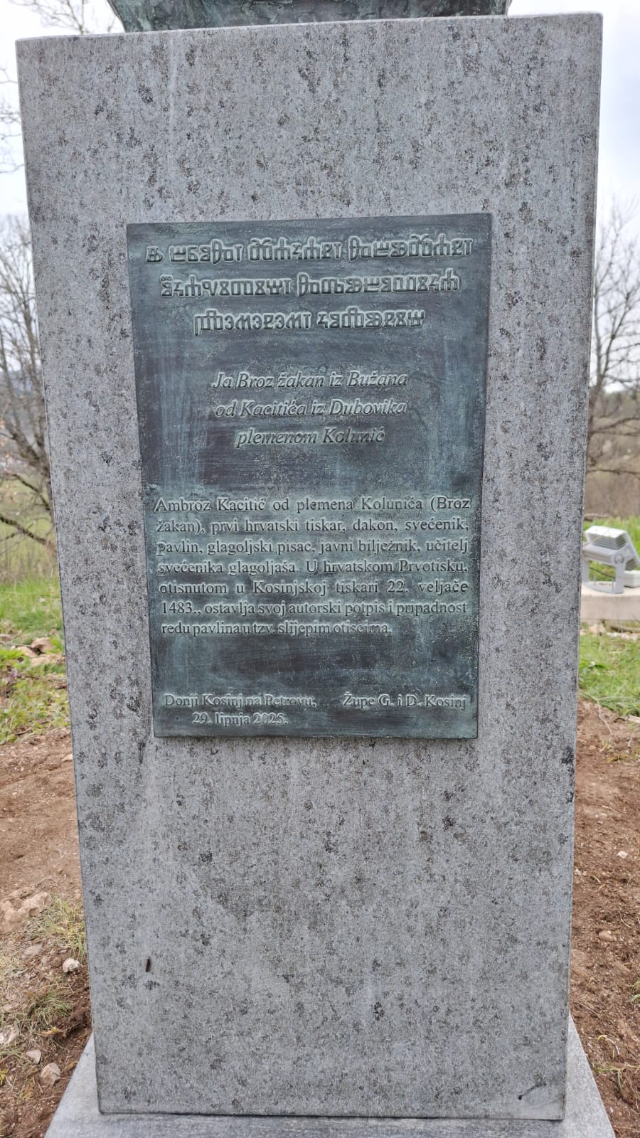 Inicijativom župnika Gornjeg i Donjeg Kosinja vlč. Pere Jurčevića i istraživača kosinjske povijesti dr. sc. Ivana Mancea pokrenuta je ideja oko izgradnje spomenika prvom hrvatskom tiskaru Ambrozu Kacitiću od plemena Kolunića. On je ostavio svoje kodirane tragove kao materijalni dokaz u formi tzv. slijepih otisaka u našoj prvoj tiskanoj knjizi, glagoljskom Misalu po zakonu rimskoga dvora od 22. veljače 1483. Tako su istraživanja književnika Zvonimira Kulundžića 1960.-tih godina predložila, dok su novija istraživanja Ivana Mancea 2023. godine u knjizi Kosinjska tiskara proširila i čvrsto utemeljila upravo Ambroza Kacitića kao tiskara/slagara koji je radio na našem Prvotisku, u prvoj hrvatskoj tiskari u gradu Kosinju. Više o Ambrozu Kacitiću može se pročitati na stranicama Kosinjska tiskara [ovdje].